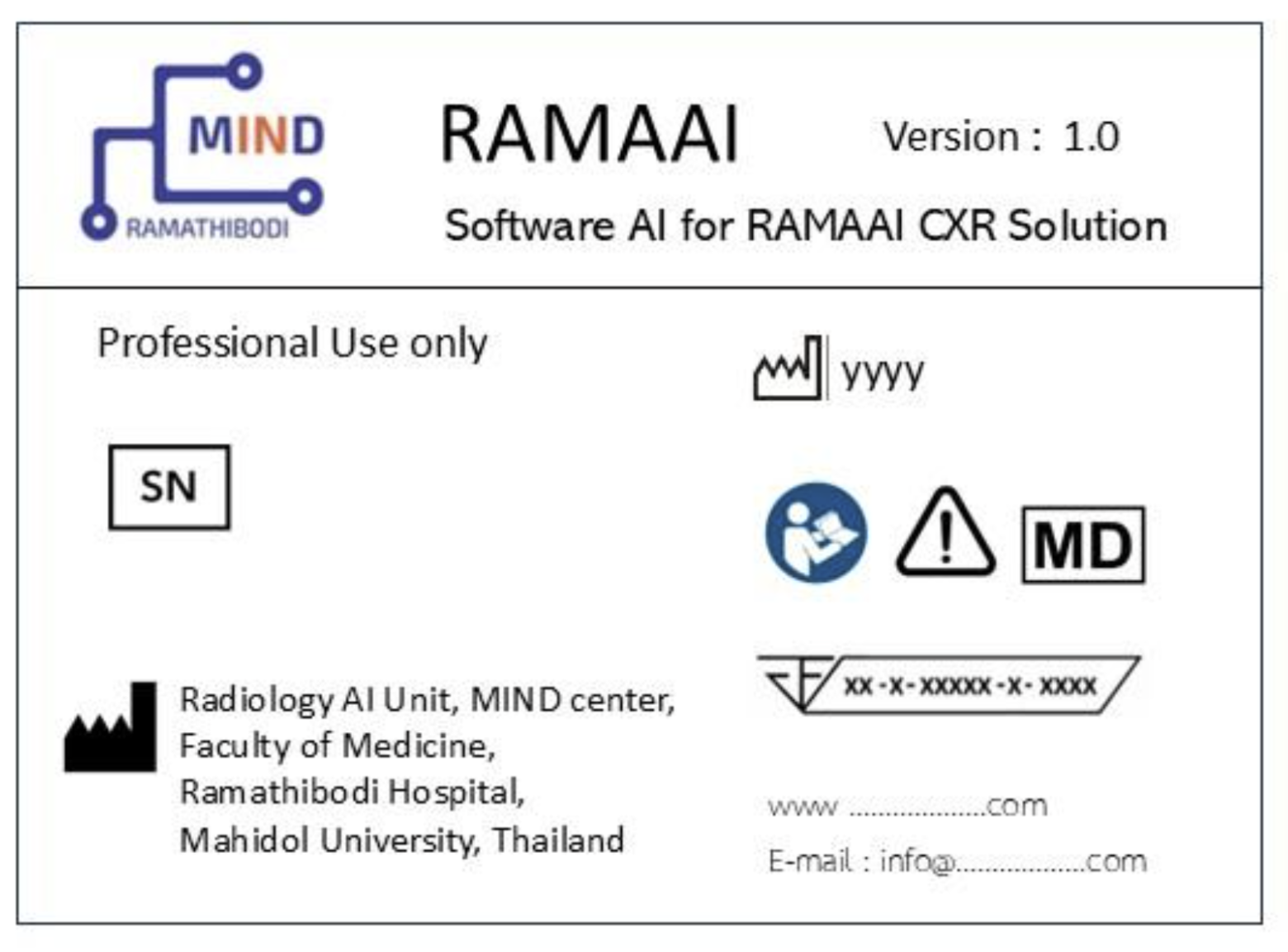 ผู้ผลิตไม่ขอรับผิดชอบต่อความเสียหายใดที่เกิดขึ้นจากความขัดข้องของซอฟต์แวร์ หรืออุปกรณ์ ในกรณีที่ผู้ใช้นำระบบซอฟต์แวร์ หรืออุปกรณ์เครื่องมืออื่น ๆ มาใช้ร่วมกับซอฟต์แวร์ RAMAAI CXR Solution การนำไปเปลี่ยนแปลง ถอดอุปกรณ์เครื่องนอกเหนือจากที่กำหนด